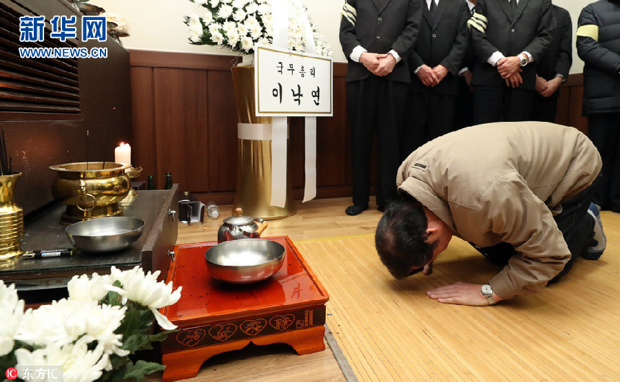 12月23日,韓國忠清北道堤川市,韓國總理李洛淵視察運動中心火災現場,并吊唁火災遇難者。據報道,21日,韓國忠清北道堤川市一運動中心發生火災,造成29死29傷,其中20名死者在火災發生時位于大樓2層的桑拿房內。近日,韓媒公布了火災現場的一組照片。照片顯示,桑拿房堆積了各種洗浴用品,應急出口幾乎被封死。(圖片來源:東方IC)