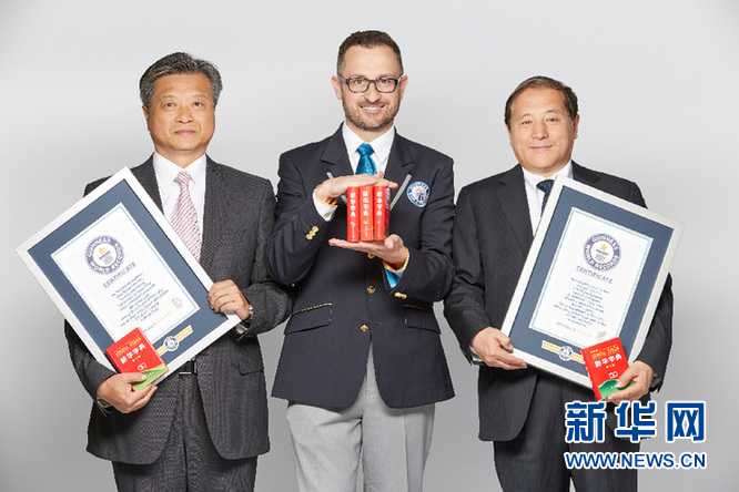 資料圖片:吉尼斯世界紀錄全球紀錄部門資深副總裁兼中國區總經理馬可(中)為《新華字典》頒發證書。(吉尼斯世界紀錄供圖)