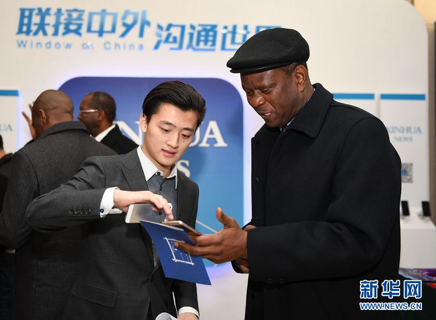 1月23日上午10:00,新華社英文客戶端上線發(fā)布會(huì)在總社大廈多功能廳舉行。圖為工作人員向嘉賓介紹新華社英文客戶端。新華社記者 李賀攝