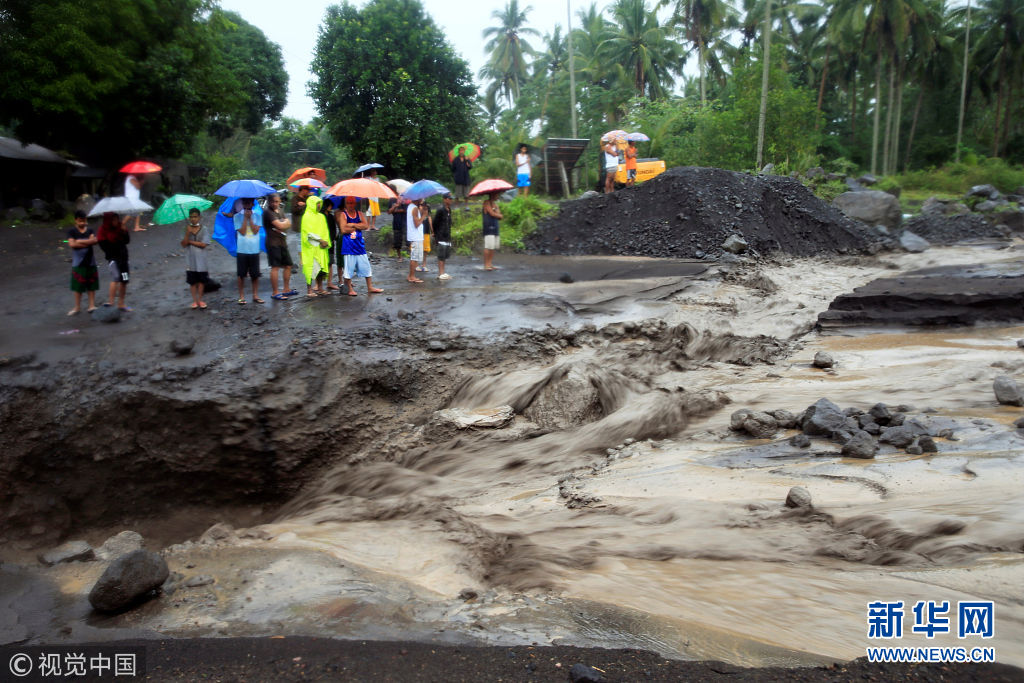 當地時間2018年1月27日,菲律賓阿爾拜省,民眾穿過混合著火山灰的泥漿河。(圖片來源:視覺中國)