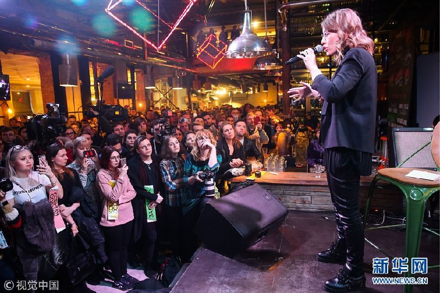當(dāng)?shù)貢r(shí)間2月3日,俄羅斯圣彼得堡,俄羅斯電視節(jié)目主持人、總統(tǒng)候選人克謝尼婭·索布恰克會見支持者。(圖片來源:視覺中國)