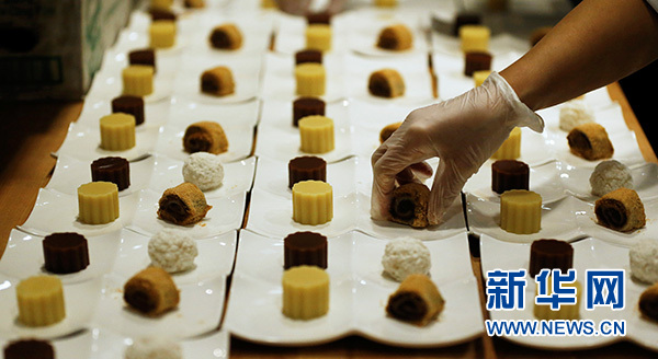 2月8日,在美國洛杉磯,廚師準備傳統(tǒng)中式點心“驢打滾”、“艾窩窩”、“豌豆黃”和“紅豆涼糕”。 新華社記者 李穎 攝