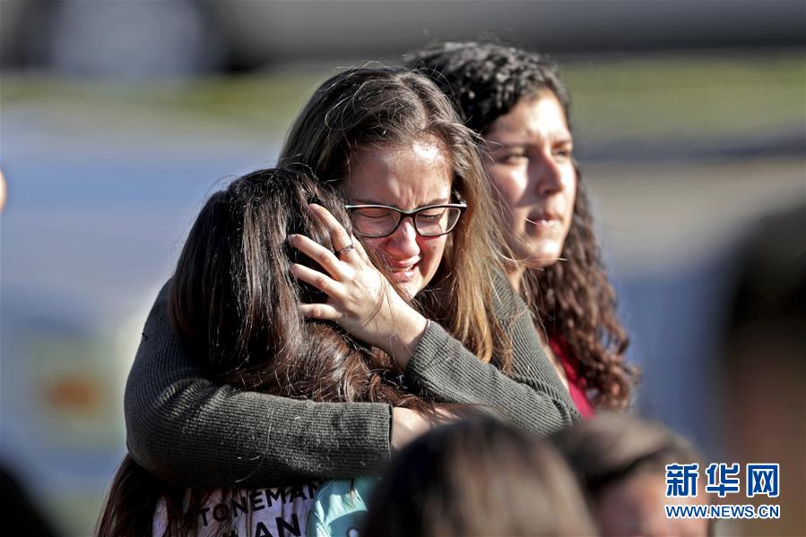 2月14日,在美國佛羅里達州帕克蘭市發生槍擊的高中,安全撤離的學生相擁而泣。美國佛羅里達州布勞沃德縣警方14日說,當地一高中發生的槍擊案已造成17人死亡。 新華社/美聯
