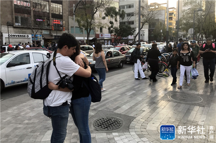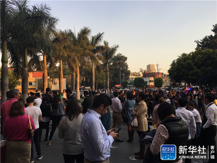 2月16日,在墨西哥首都墨西哥城,人們?cè)趹?hù)外避險(xiǎn)。新華社記者李文清攝