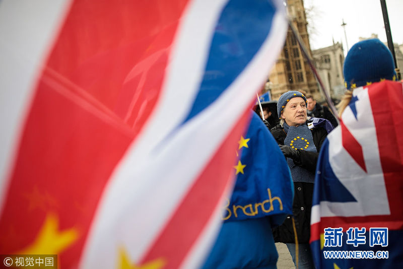 2月26日,英國倫敦,示威者在議會大廈外抗議“脫歐”。(圖片來源:視覺中國)