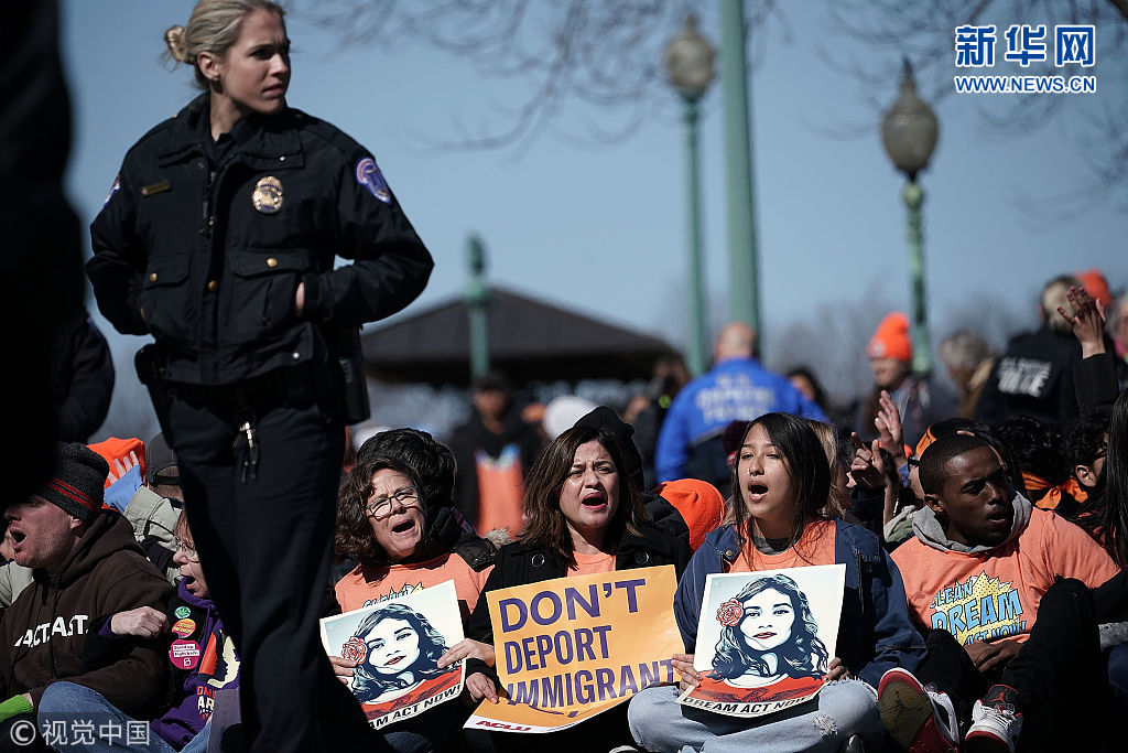 當地時間2018年3月5日,美國華盛頓,移民活動家在國會山舉行集會,抗議特朗普終結“夢想法案”計劃。(圖片來源:視覺中國)