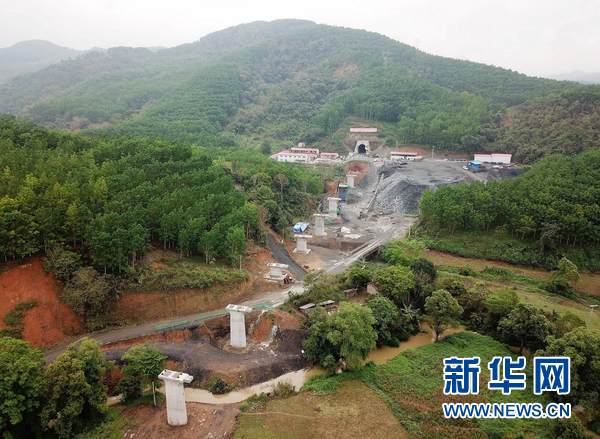 這是3月27日在老撾南塔省航拍的正在施工建設中的橋梁。新華網發 劉艾倫攝