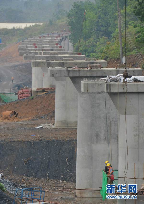 這是3月27日在老撾南塔省航拍的正在施工建設(shè)中的橋梁。新華網(wǎng)發(fā) 劉艾倫攝