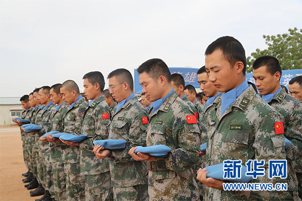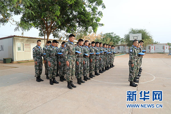 祭奠儀式上,大型機械鳴笛三聲,哀思樂曲響起,全體官兵整裝列隊,集體脫帽為犧牲在維和戰場上的英烈默哀三分鐘。隨后,官兵代表致辭,追憶維和英烈們無私奉獻、舍生取義的光輝事跡,表達為達爾富爾地區和平建設而努力奮斗的堅定決心。