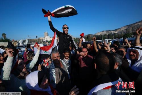 當地時間4月14日,敘利亞首都大馬士革民眾在街頭發起示威游行,抗議美國聯合英法兩國對首都大馬士革發起空襲行動。