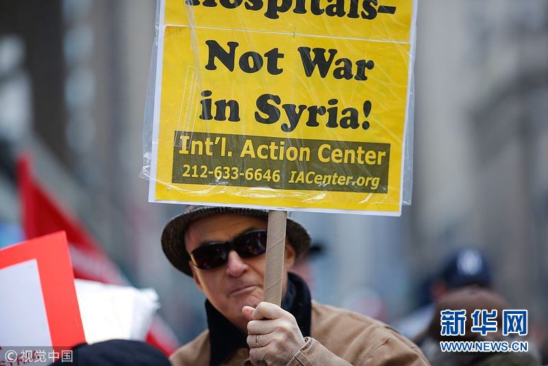 4月15日,美國(guó)紐約,民眾舉行反戰(zhàn)游行,抗議美英法聯(lián)軍襲擊敘利亞。(圖片來源:視覺中國(guó))