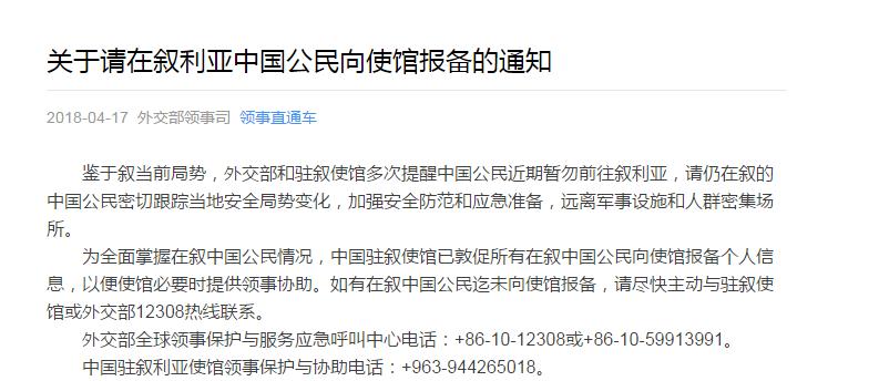 消息稱,為全面掌握在敘中國公民情況,中國駐敘使館已敦促所有在敘中國公民向使館報備個人信息,以便使館必要時提供領事協助。如有在敘中國公民迄未向使館報備,請盡快主動與駐敘使館或外交部12308熱線聯系。