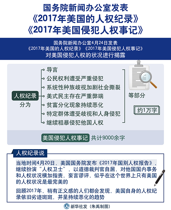 新華社北京4月24日電(記者黃小希、程卓)國務(wù)院新聞辦公室24日發(fā)表《2017年美國的人權(quán)紀(jì)錄》《2017年美國侵犯人權(quán)事記》,對美國侵犯人權(quán)的狀況進(jìn)行揭露。