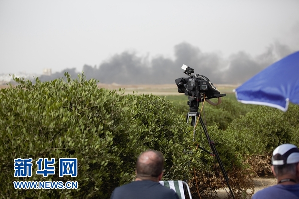 正午的驕陽烤得人大汗淋漓,被大風卷起的黃沙一個勁地往眼睛里鉆。雖然記者的眼睛經(jīng)常被汗水和沙子蹂躪地睜不開,但是這并不妨礙記者用相機和攝像機記錄下加沙地帶那一頭發(fā)生的一幕幕??棺h的巴勒斯坦人燃燒輪胎所產生的濃煙,遮住了大片天空,刺鼻的焦味隨風飄散。