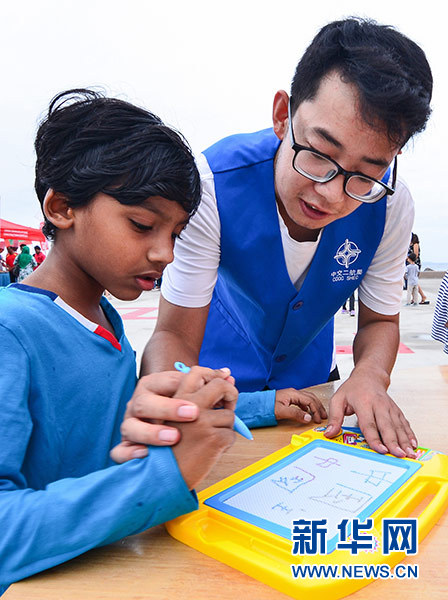 5月4日,在馬爾代夫首都馬累市中心停機(jī)坪廣場(chǎng),中國(guó)志愿者教當(dāng)?shù)貎和瘜?xiě)漢字。新華社發(fā)(杜才良 攝)