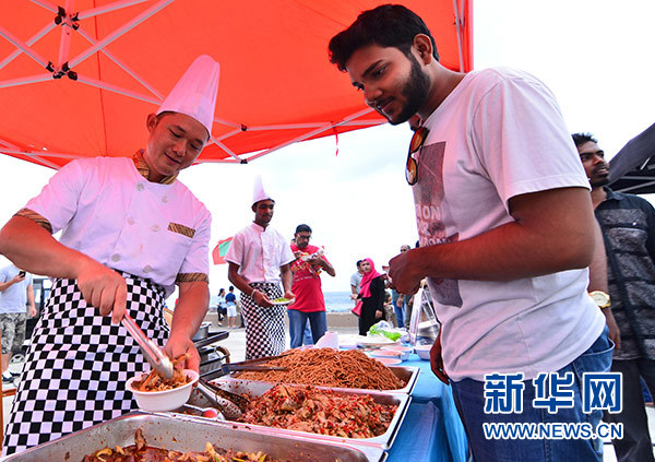 5月4日,在馬爾代夫首都馬累市中心停機(jī)坪廣場(chǎng),一名當(dāng)?shù)啬凶樱ㄓ遥┢穱L中國(guó)美食。 新華社發(fā)(杜才良 攝)