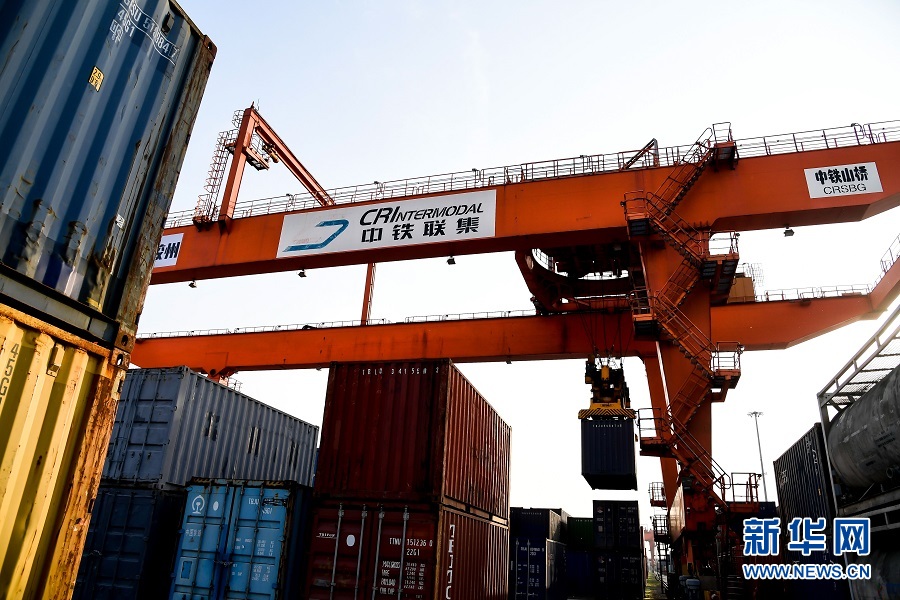 占地1800畝的中鐵聯(lián)集青島中心站內(nèi),藍色、白色的集裝箱把場站裝點成一片“集裝箱海洋”;橫穿場站的兩條鐵軌旁,數(shù)座巨型龍門吊繁忙作業(yè),來自海上的貨物被搬運至將遠行的國際班列上……