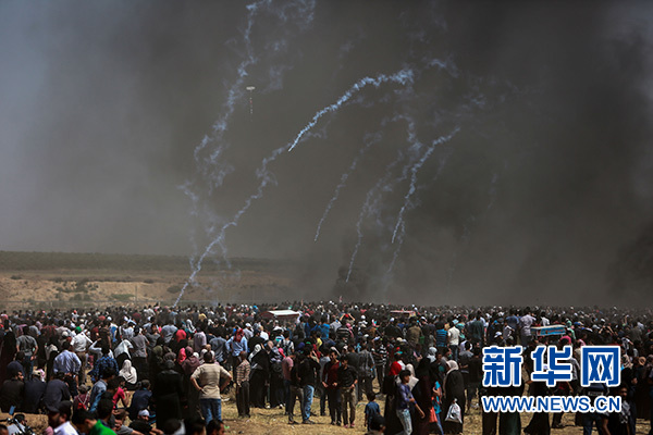 5月14日,在加沙城以東的加沙地帶與以色列交界地區,巴勒斯坦示威者與以色列軍隊發生沖突。新華社發