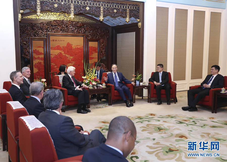 5月15日,國家副主席王岐山在北京中南海會(huì)見出席第十輪中美工商領(lǐng)袖和前高官對(duì)話的美方代表。 新華社記者 龐興雷 攝