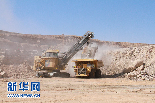 5月11日,在納米比亞西部的中廣核湖山鈾礦,載重330噸的礦用車在礦坑內(nèi)裝載礦石。新華社記者 吳長(zhǎng)偉 攝