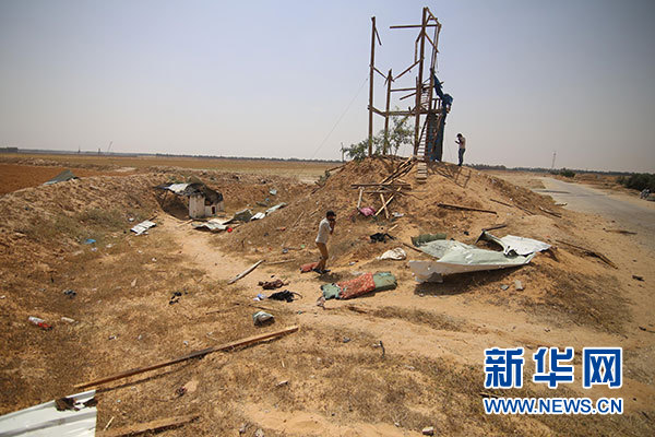 5月27日,在加沙地帶拉法地區,巴勒斯坦人查看遭到以軍炮擊的軍事哨所。新華社發(哈立德·奧馬爾 攝)