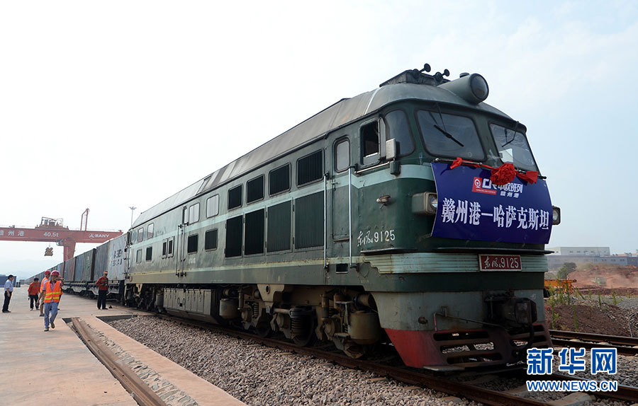 在江西省贛州市南康區贛州港,“贛州港至哈薩克斯坦”中歐班列等待發車(2017年7月27日攝)。新華社記者 彭昭之 攝