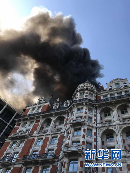 這是6月6日在英國倫敦騎士橋附近拍攝的起火的文華東方酒店。新華社發(鄧漢聲攝)