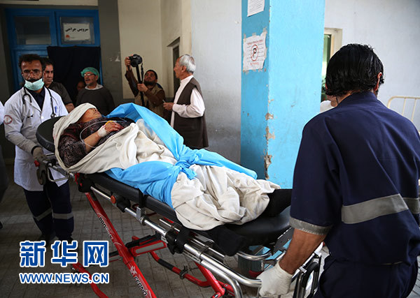 6月11日,在阿富汗首都喀布爾,人們將一位襲擊事件中受傷的婦女送往醫院。新華社發(拉赫馬特 攝)