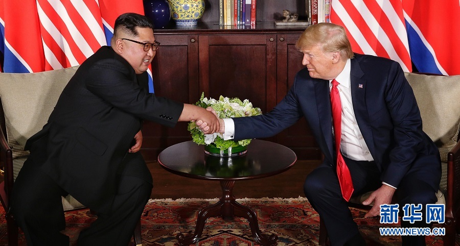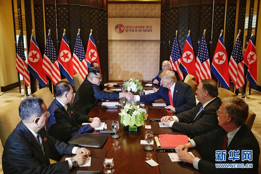長期敵對的朝美兩國當天舉行首次領導人會晤,就朝鮮半島無核化及和平機制構建等事務展開磋商。