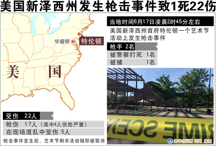 槍擊事件于當地時間凌晨2時45分左右發生在一個藝術節活動上。特倫頓所在的默瑟縣檢察官安杰洛·奧諾弗里告訴媒體,事件中有兩名槍手,其中一名槍手被現場的警察打死,另一人被逮捕。