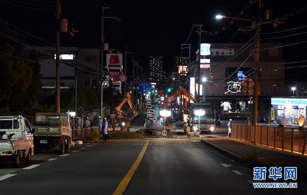 6月18日,在日本大阪,工程人員搶修破損道路。據日本氣象廳消息,當地時間18日上午7時58分,日本大阪府發生6.1級地震。新華社記者馬平 攝