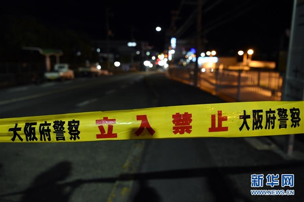 6月18日,在日本大阪,警方封鎖破損道路。據日本氣象廳消息,當地時間18日上午7時58分,日本大阪府發生6.1級地震。新華社記者馬平 攝