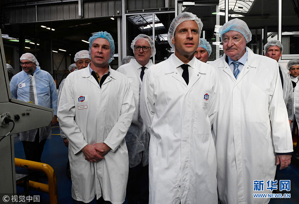 6月20日,法國(guó)普盧維安,法國(guó)總統(tǒng)馬克龍視察當(dāng)?shù)嘏D讨破窂S(chǎng),并品嘗了一份甜點(diǎn)。(圖片來(lái)源:視覺(jué)中國(guó))