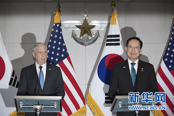 6月28日,在韓國首爾,韓國國防部長官宋永武(右)與到訪的美國國防部長馬蒂斯出席新聞發布會。新華社發(聯合采訪團供圖)