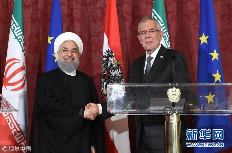 2018年7月4日,奧地利維也納,伊朗總統魯哈尼抵達奧地利進行訪問,會晤奧地利總統范德貝倫。伊朗總統魯哈尼2日出發前往瑞士和奧地利訪問。他這次西歐行將重點討論伊朗核問題全面協議。(圖片來源:視覺中國)