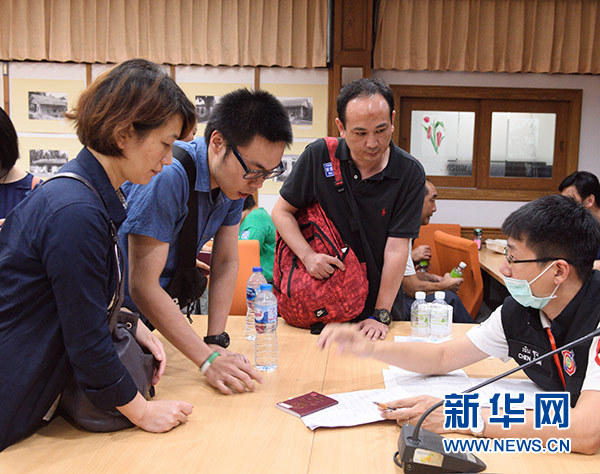 7月9日,在泰國普吉島的哇集拉醫院,來自蘇梅島的旅游警察志愿者(右)幫助遇難者家屬做確認遺體登記工作。新華社記者 秦晴 攝