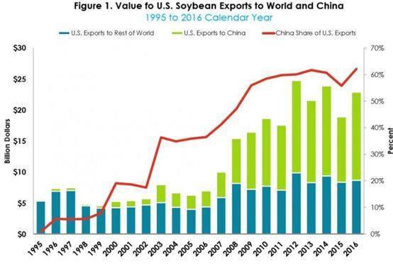 ▲圖為美國(guó)從1995年到2016年出口給全世界和中國(guó)的大豆情況,可以看到中國(guó)是美國(guó)大豆產(chǎn)業(yè)中最大且無法替代的市場(chǎng)