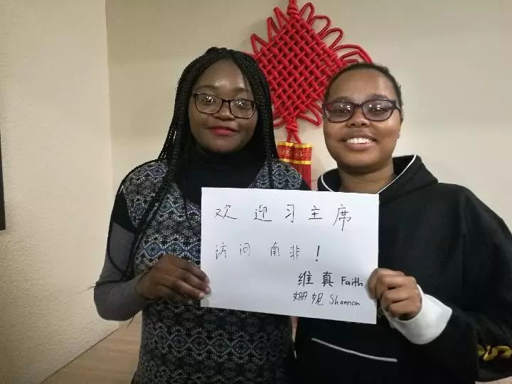 “雖然中文學(xué)起來(lái)很有挑戰(zhàn)性,但這也恰恰是吸引我的原因。”姍妮和同伴維真向記者驕傲地展示她們書(shū)寫(xiě)的漢字:歡迎習(xí)主席訪問(wèn)南非!
