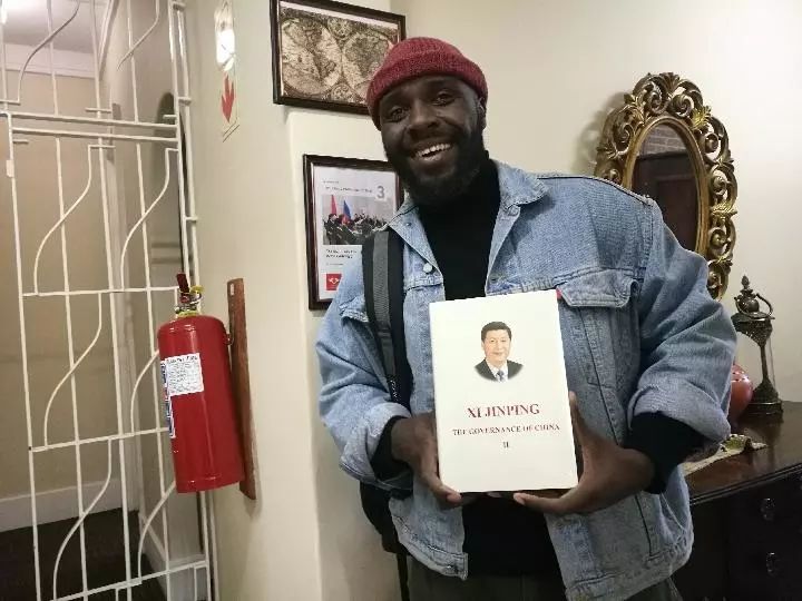 2018年7月20日,南非約翰內(nèi)斯堡大學(xué)孔子學(xué)院,學(xué)院職員邦加恩向記者展示剛從圖書(shū)室借到的《習(xí)近平談治國(guó)理政》(第二卷)英文版。(新華社記者劉衛(wèi)兵攝)