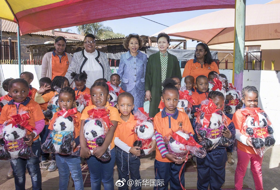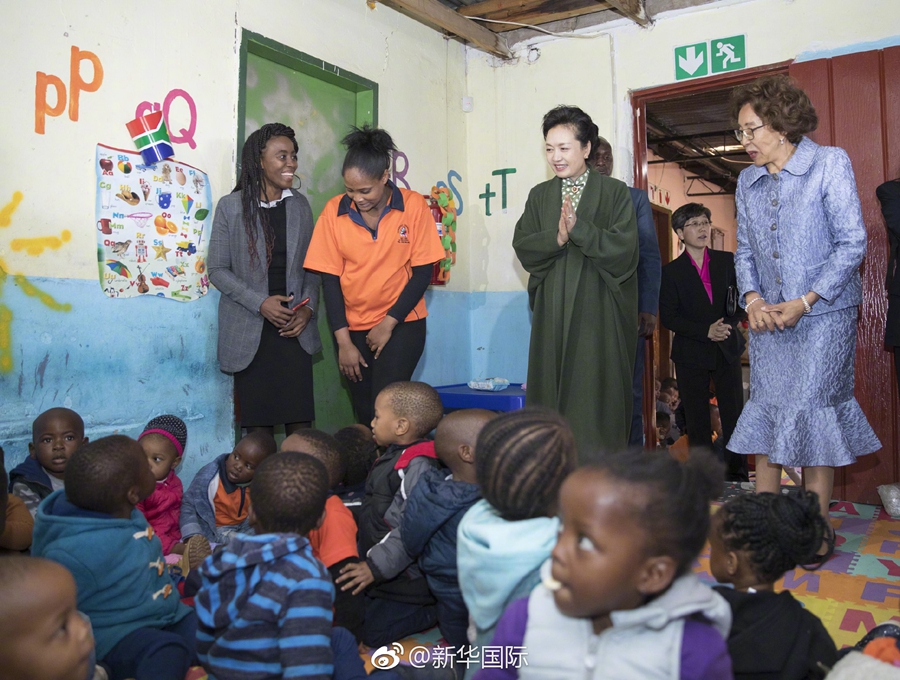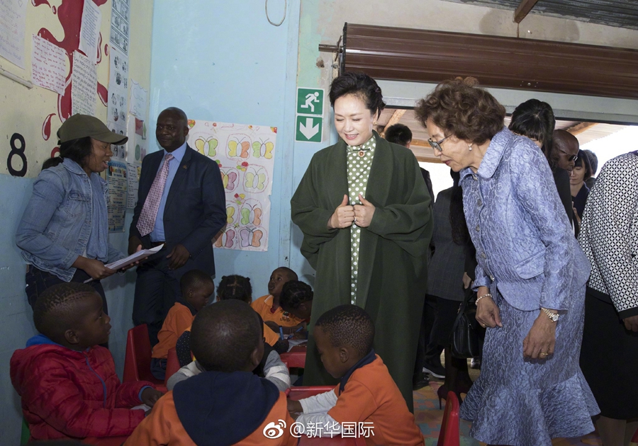 彭麗媛和莫采佩抵達(dá)時,非洲自助基金會負(fù)責(zé)人、托兒所園長等在門口迎接。40名活潑可愛的南非兒童揮舞中南兩國國旗列隊(duì)歡迎,彭麗媛俯身同孩子們親切握手問候。彭麗媛來到庭院,20多名兒童手持兩國國旗,輪流用中英文高聲呼喊“歡迎歡迎”。孩子們伴著俏皮輕快的舞蹈動作,合唱英文歌曲《歡迎您》、用中文吟唱中國古詩兒歌《詠鵝》、演唱南非說唱歌曲。彭麗媛認(rèn)真聆聽,頻頻點(diǎn)頭微笑、不時鼓掌稱贊,夸獎孩子們中文發(fā)音準(zhǔn)確。彭麗媛來到教室,觀看兒童繪畫、識字,和孩子們用當(dāng)?shù)貍鹘y(tǒng)手語互致問候。彭麗媛向孩子們贈送玩具、文具、圖書,并在孩子們自己創(chuàng)作的手印畫上題寫“前程似錦”,勉勵孩子們好好學(xué)習(xí)、茁壯成長。彭麗媛表示,兒童成長關(guān)乎一個國家未來。兒童早期教育,最重要的是樹德育人,引導(dǎo)他們樹立遠(yuǎn)大志向、培育美好心靈。希望中南友好事業(yè)從娃娃抓起,讓他們長大后做兩國友好事業(yè)的傳承者和接班人。