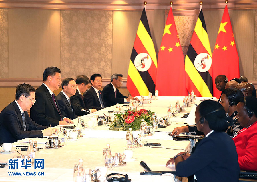 7月26日,國家主席習近平在南非約翰內斯堡會見烏干達總統穆塞韋尼。 新華社記者 廖宇杰 攝