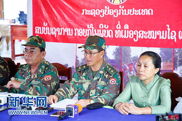 7月28日,老撾人民軍總參謀部副總參謀長、潰壩事故救援總指揮坎良·烏塔凱山(中)在災區薩南賽縣舉行的救援情況發布會上說,截至當晚,潰壩事故的救援力量共發現8具遇難者遺體,仍有123人生死不明。新華社發
