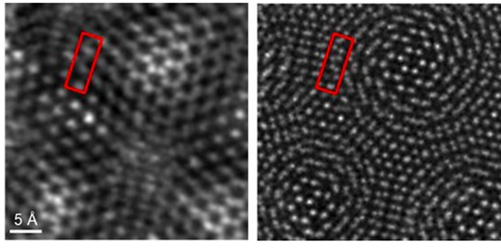 這是領先于過去成像方法的一個重要步驟,以前看不清是因為探測器只收集了一部分散射的電子。此前,在同樣的低電壓情況下,得到的空間分辨率一般小于0.1納米。兩張圖相比,一個線條模糊,一個能看得顆粒分明。