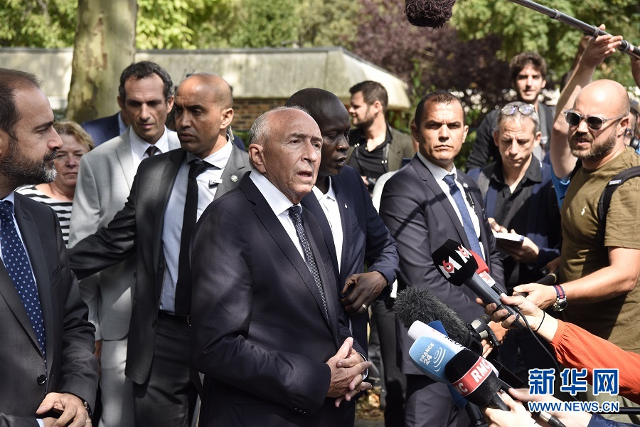 8月23日,在法國巴黎西南郊特拉普市,法國內政部長科隆(中)向媒體介紹情況。 新華社記者陳益宸攝