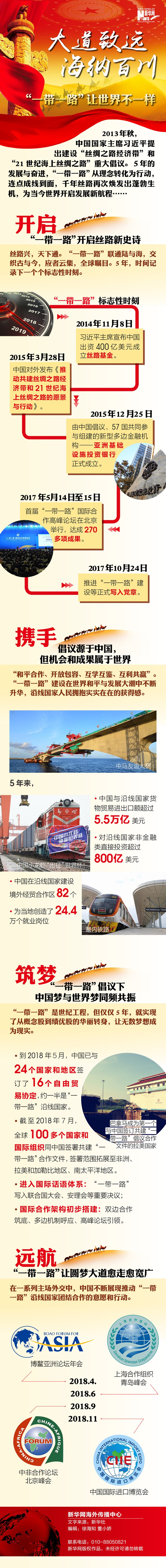 5年的發(fā)展與奮進,“一帶一路”從理念轉(zhuǎn)化為行動,連點成線到面,在廣袤大陸上落地生根,在浩瀚海洋中乘風(fēng)破浪,千年絲路再次煥發(fā)出蓬勃生機,為當(dāng)今世界開啟發(fā)展新航程……