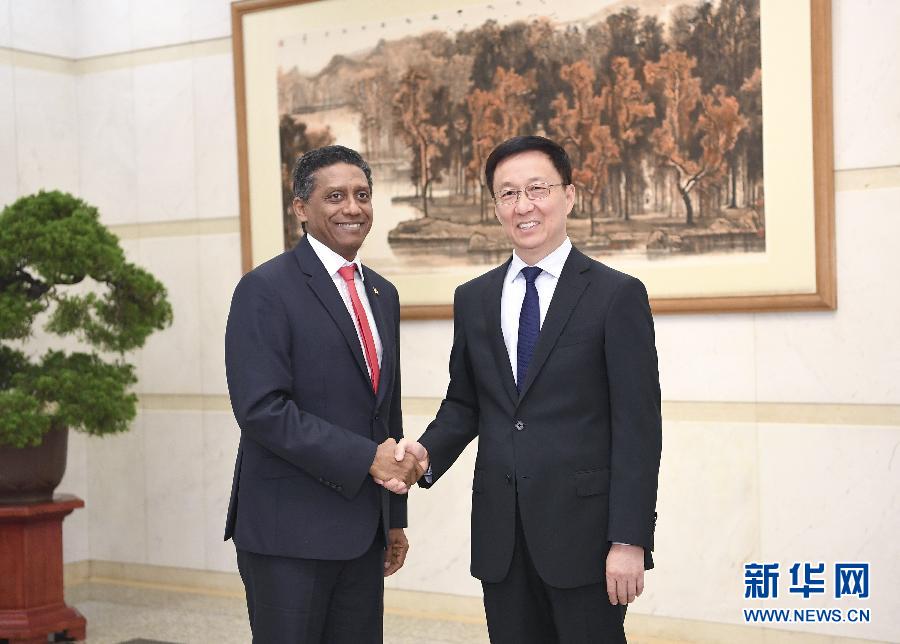 9月1日,國務院副總理韓正在北京釣魚臺國賓館會見塞舌爾總統富爾。 新華社記者 燕雁 攝