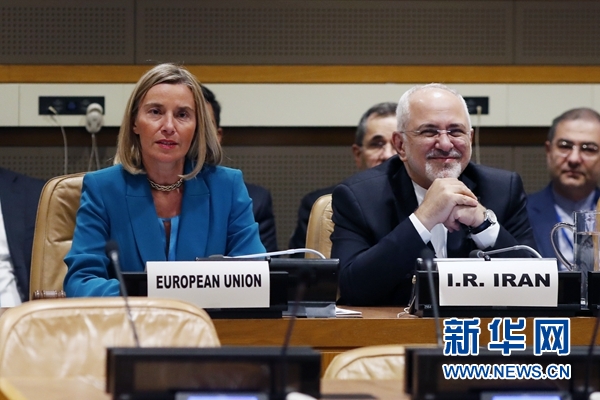 9月24日,在位于紐約的聯合國總部,歐盟外交和安全政策高級代表莫蓋里尼(前排左)同伊朗外長扎里夫出席伊朗核問題外長會。新華社記者李木子攝