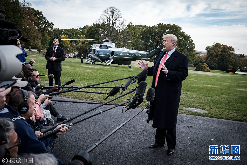 當地時間2018年10月31日,美國華盛頓,美國總統特朗普啟程前往佛羅里達州出席競選集會,在白宮南草坪發表講話。特朗普稱,計劃部署在美墨邊境的現役軍人數量或增加至15000人,以嚴防來勢洶洶的“大篷車”移民。(圖片來源:視覺中國)