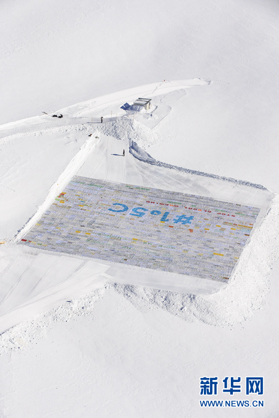 世界最大明信片被放置在瑞士少女峰下的阿萊奇冰川上,占地面積約2500平方米,中心位置印有“停止全球變暖”“1.5攝氏度”等字樣。