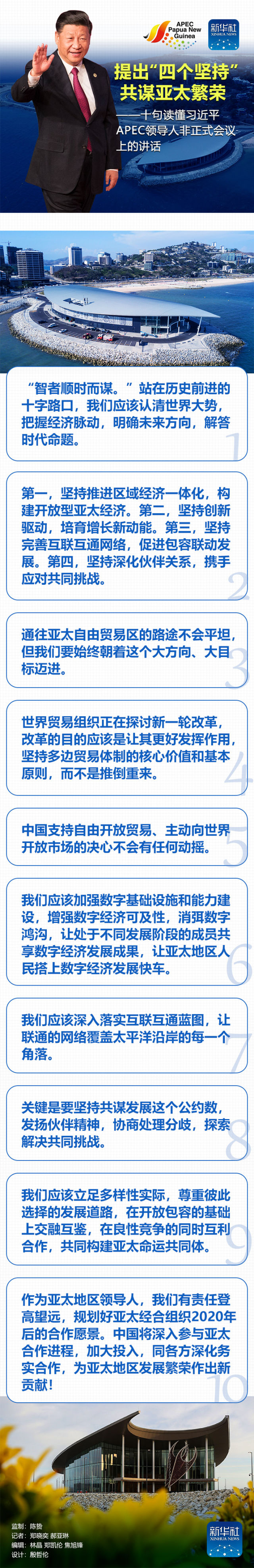 很高興同大家相聚在美麗的莫爾茲比港。亞太經合組織成員領導人首次在太平洋島國地區(qū)聚首,圍繞“把握包容性機遇,擁抱數(shù)字化未來”的主題,回顧合作歷程,共商亞太愿景。我謹對巴布亞新幾內亞政府特別是奧尼爾總理為籌備本次會議付出的努力,表示衷心的感謝!